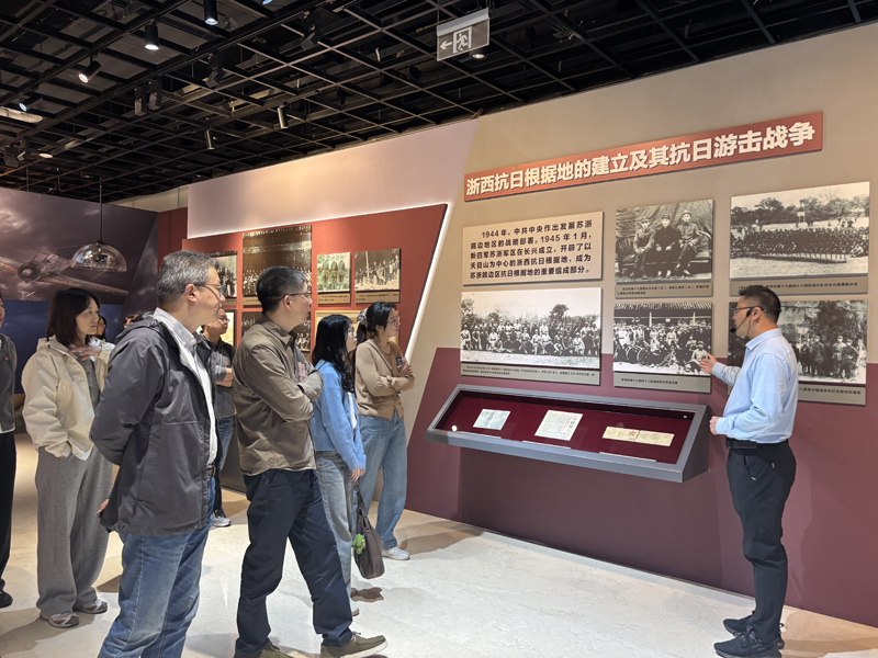 展览以浙江抗战历程为主线,分为“抗日战争全面爆发前的浙江局势”“抗日民族统一战线在浙江的建立与巩固”“中国共产党领导下的浙江敌后抗日”等多个篇章,通过档案文献、图片资料、实物展品和多媒体影像等多种形式,全景式展现了浙江抗战波澜壮阔的历史图景。在参观过程中,全体党员干部职工认真聆听讲解,仔细观看展陈内容,不时驻足交流,共同重温那段铭刻苦难与抗争、浸透热血与牺牲的峥嵘岁月,深切感悟到中国共产党在全民族抗战中的中流砥柱作用,以及中国人民为世界反法西斯战争胜利作出的卓越贡献。
