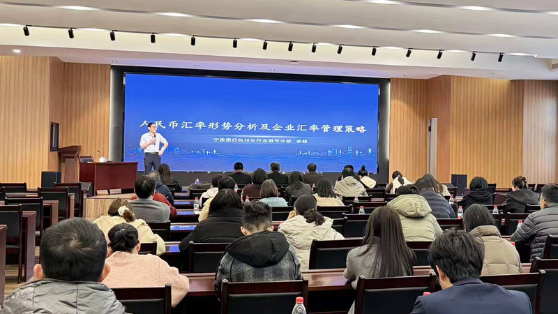 1月14日,太阳成集团tyc234cc集团组织开展人民币汇率形势分析及汇率管理策略专题讲座,特别邀请宁波银行杭州分行金融市场部总经理助理谢超进行授课指导。集团副董事长吴元明、副总经理马茂灯,宁波银行吴山支行行长孔均等出席会议,集团财务会计部经理应帅作开场动员,相关职能部门及外贸企业共计60余人参加培训。